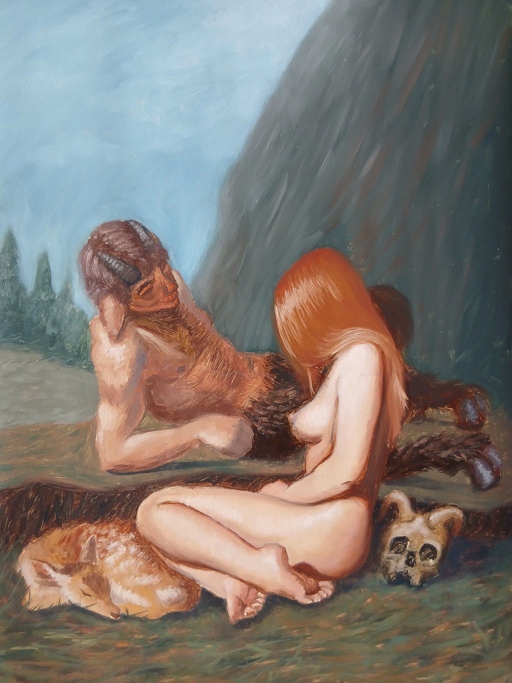 Study or oil sketch on paper. It depicts a faun encountering a nymph on a mountain. Next to the nymph, a fawn can be seen resting, and behind her, a faun’s skull. Could the faun depicted here be the next victim? The work exudes a mythological atmosphere—an imaginary setting, a silent scene that speaks volumes.