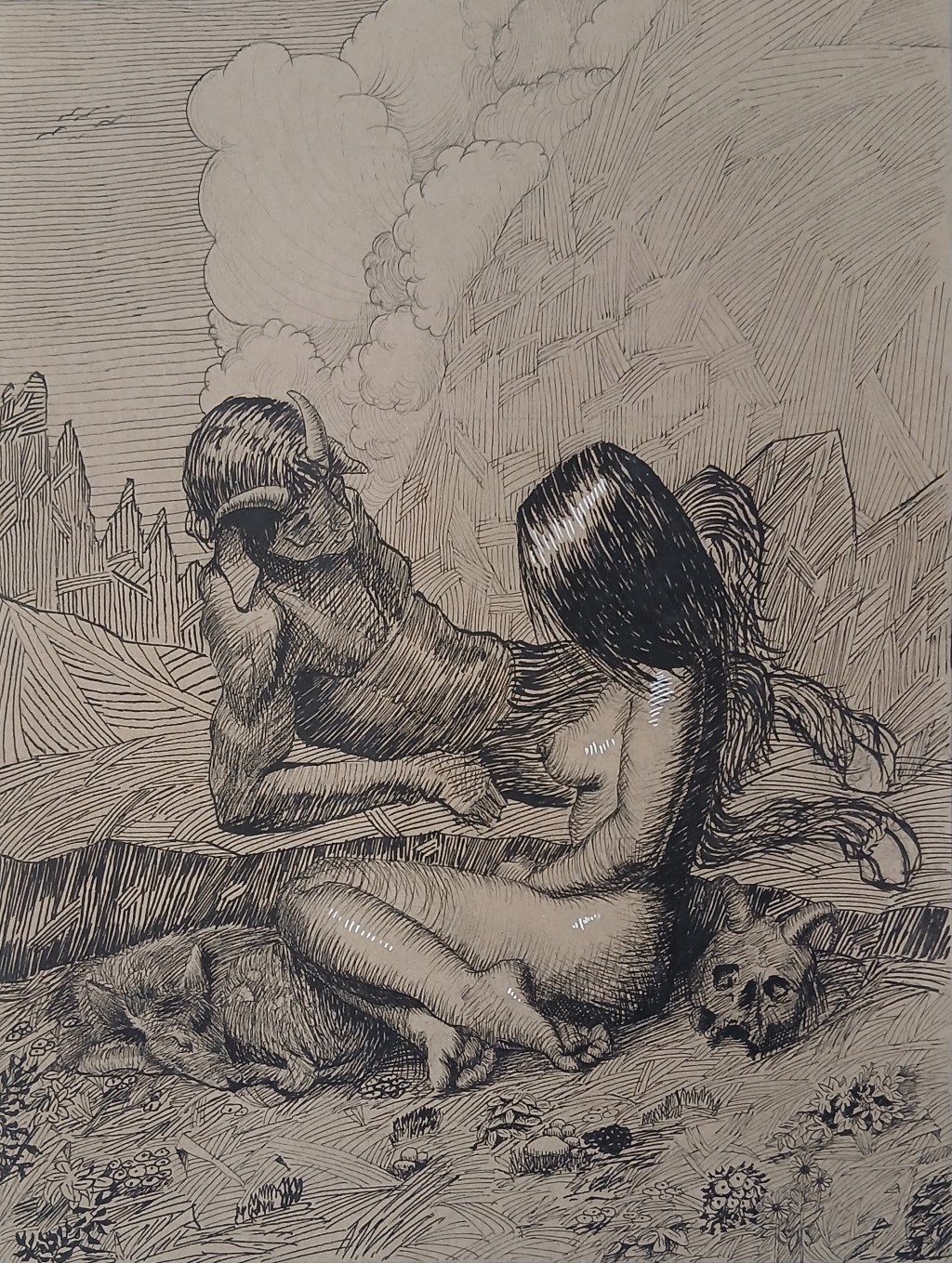 Illustration created with markers on paper. This is the drawn version of the previous oil study. Lines are used consistently in various directions using the hatching technique. It depicts a faun encountering a nymph on a mountain. Next to the nymph, a fawn is seen resting, and behind her, the skull of a faun. Could the faun depicted here be the next victim? The work exudes a mythological atmosphere: an imaginary setting, a silent scene that says it all.